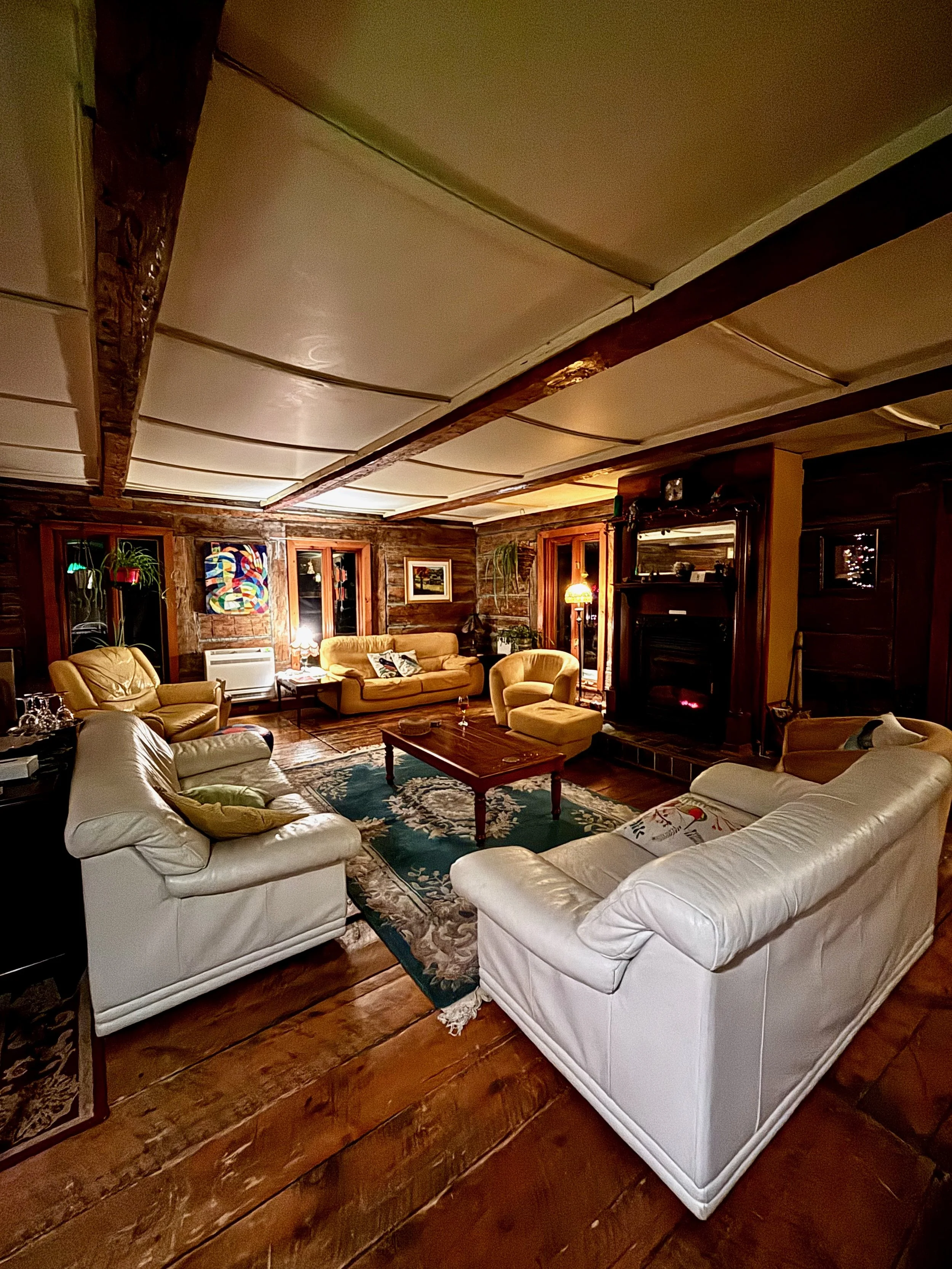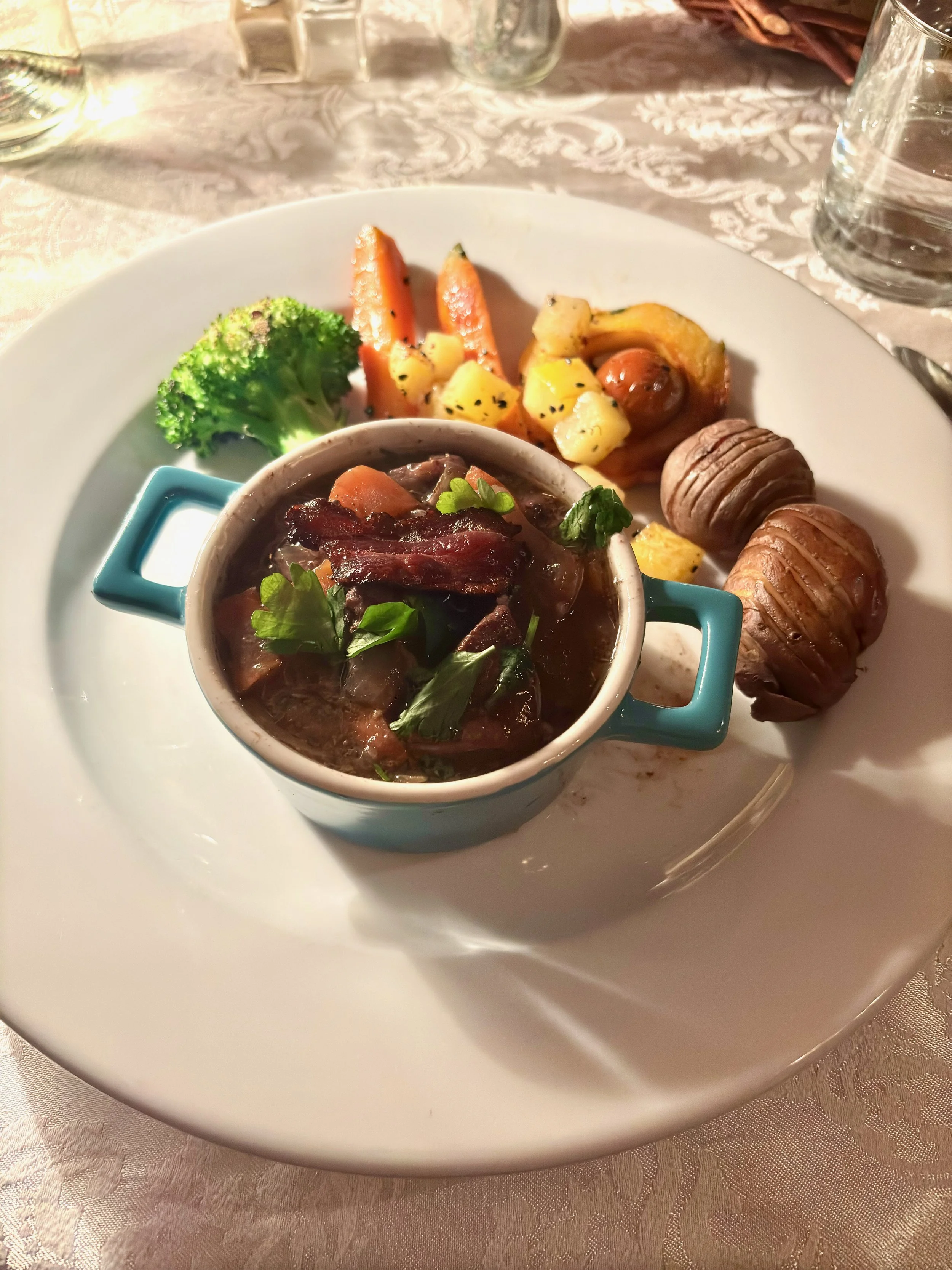 Conscients de notre budget, nous avions décidé d’apporter des collations et des fromages pour manger dans la chambre. Cependant, nous avons oublié les fromages à la maison, ce qui nous a forcés à essayer le restaurant de l’auberge. Une table d’hôte avec quatre services est offerte, mais nous avons choisi un repas à la carte chacun, soit le canard et le bœuf bourguignon. Nous avons beaucoup apprécié le repas, d’autant plus que c’est un « apportez votre vin », alors nous avons pu apporter les consommations que nous nous étions procurées auparavant.