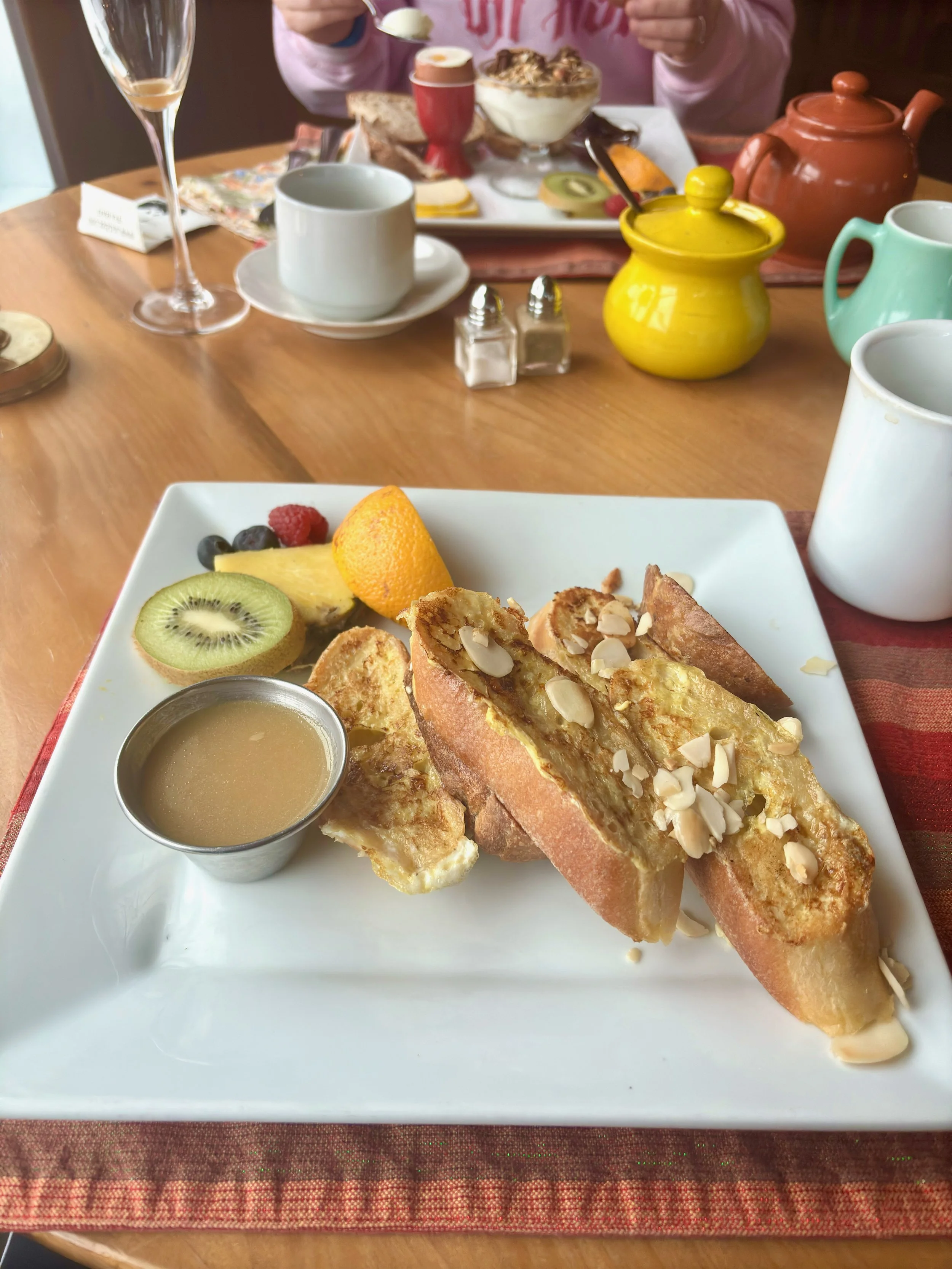 Le déjeuner est inclus dans le prix de la chambre, et il était vraiment délicieux. Nous avons mangé des pains dorés avec de la crème d’érable ainsi qu’un œuf mollet accompagné de granola, fromage, fruits et pain.