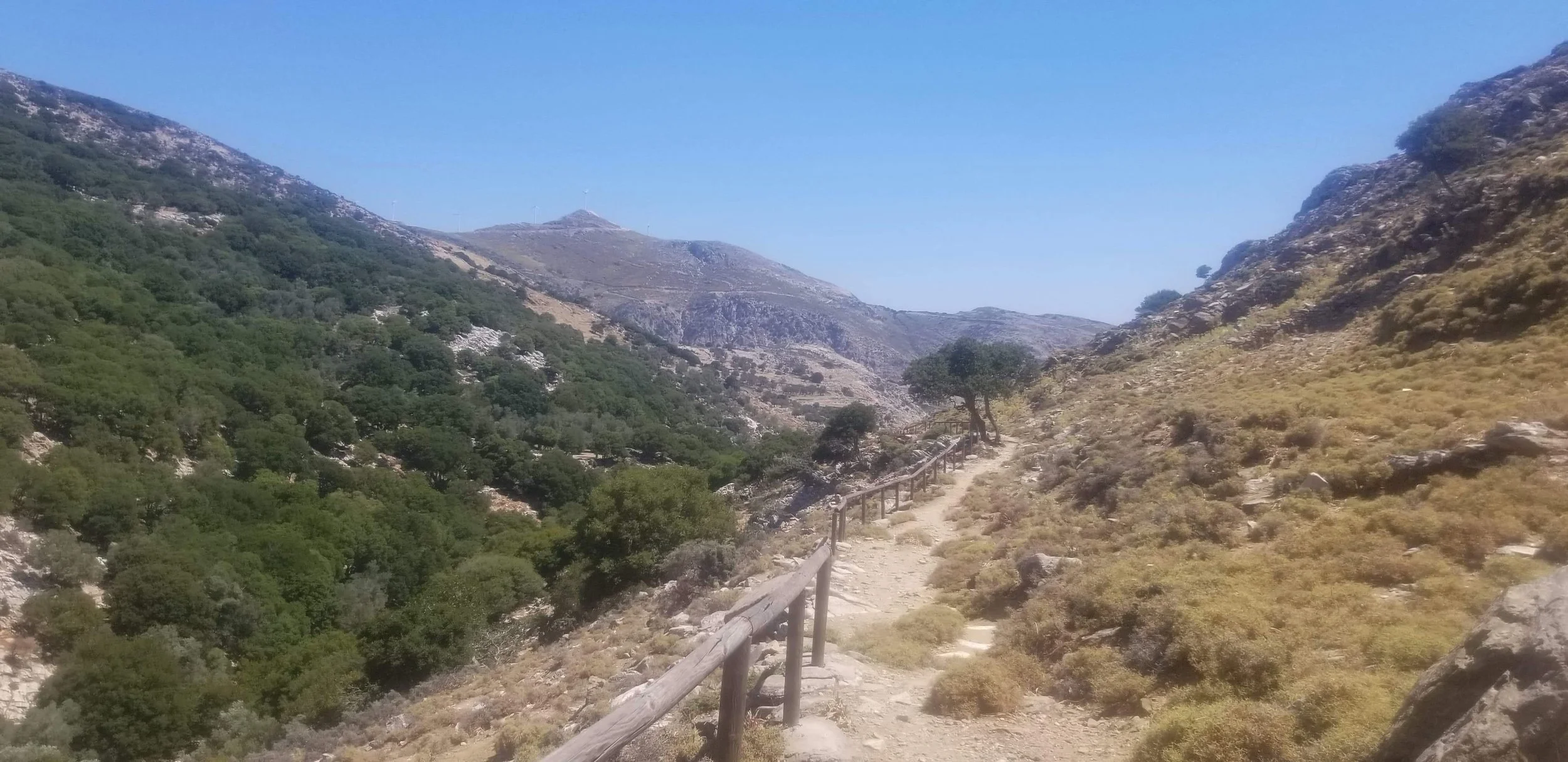 Pour explorer les petits villages, nous avons pris un autobus. Les autobus sur l’île partent tous d’ici. L’organisation laisse à désirer et tout est un peu confus, mais nous avons finalement pu embarquer dans le bon bus vers Apeiranthos. C’est un charmant village qui est aussi le point de départ de quelques randonnées. Nous avons fait celle qui menait vers l’église Agia Kyriaki. La marche n’est pas difficile et vous aurez de beaux points de vue sur la mer et la vallée.