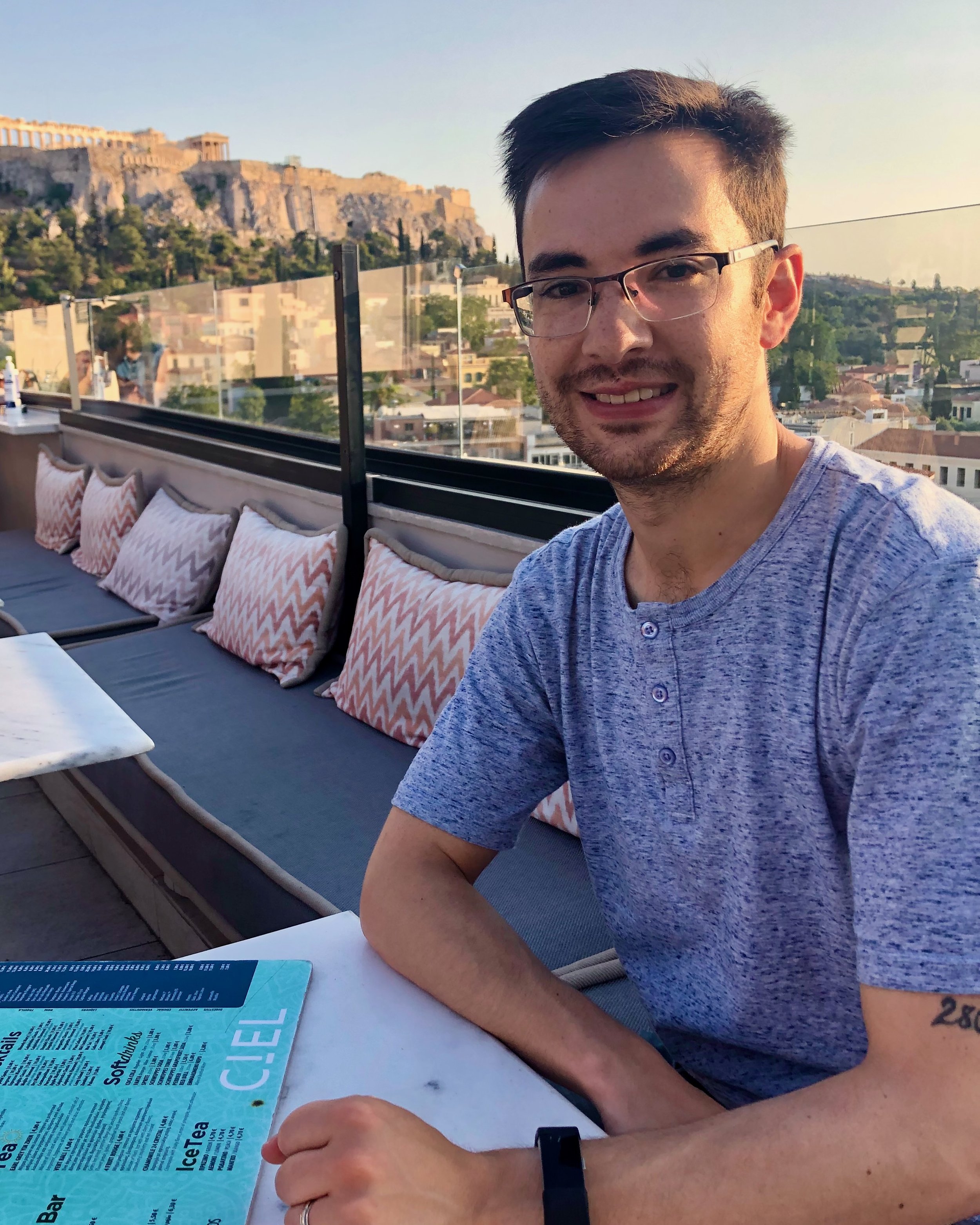 Notre première journée a surtout été passée à récupérer du décalage horaire. De l’aéroport, la ligne de métro numéro 3 (ligne bleue) vous emmène directement au centre de la ville. En soirée, nous avons soupé sur un rooftop bar. Il existe de nombreux restaurants avec terrasse sur un toit à Athènes, permettant de déguster un bon repas en admirant la vue sur l’Acropole d’Athènes.